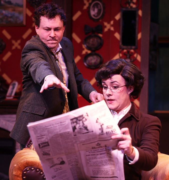 Christopher Wren (Jonathan Cobrda), left, reaches to grab the paper from Miss Casewell (Hannah Embree) after she tells him there’s an article about a murder