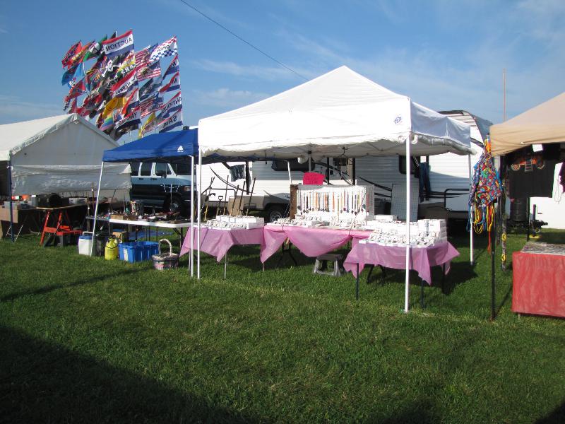 A typical vendor space at a flea market, festival or fair is rented in 10′ increments. (Our canopies/tents are 10 x 10) With our old Starcraft trailer we could get by with a 20′ space. We would park the trailer in the back of the space, and then have room to set up our canopies in front of the trailer.