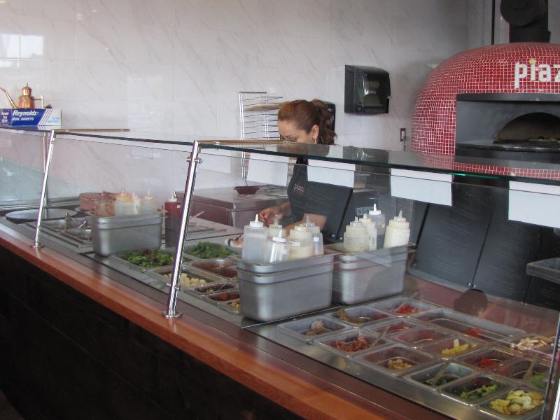The brick oven is from Italy and can prepare a pizza in three minutes. From the time we ordered and watched our pizzas prepared to pick up ready to eat a mere 5 minutes had passed! No 15 to 20 minute wait for your pizzas at Piaza. The menu also includes salads and grilled piadas.