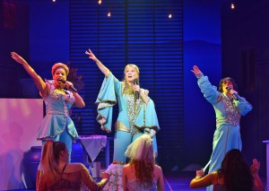 The Dynamos, Donna (Amy Bodnar), center, Tanya (Jalynn Steele), left, and Rosie (Lanene Charters) sing “Super Trouper” during a party for the bride-to-be Sophie