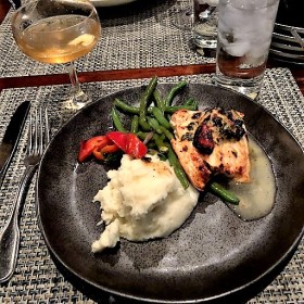 Our cocktails were delivered quickly, along with warm bread and butter. We ordered the Lump Crab cake for our appetizer. It was delicious. Sher had ordered the Blackened Chicken Fettuccine without the chicken. I had the Crab and Shrimp Stuffed Salmon. We were both delighted with our choices from the menu. Pricing was definitely in the $$$$ range, but we both felt that the price was worth it.
