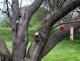 The weather is finally getting nice enough for some days out in the backyard. We bought feed for our tube feeder, a hummingbird feeder and a couple suet cages.