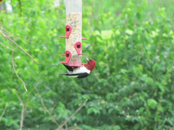 Then suddenly Sher and I witnessed the arrival of one of the most striking birds in North America. The Red-headed Woodpecker has beautiful crimson head plumage accompanied by a pure white body and wings that are half white and half ink black. These birds are striking both at rest and in flight. This one was kind enough to stick around on the feeder long enough for the capture you see above.