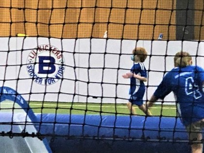 But we were there for the soccer game our grandson was to play. He is in first grade and plays once a week in a league at Arena Sports. There were eight kids in his group/team. The first half of the session is spent learning the basics. There are two coaches giving the kids a four to one ratio of coach to players. The second half of the session is an actual scrimmage game with half the kids in colored vests, thus establishing teams.