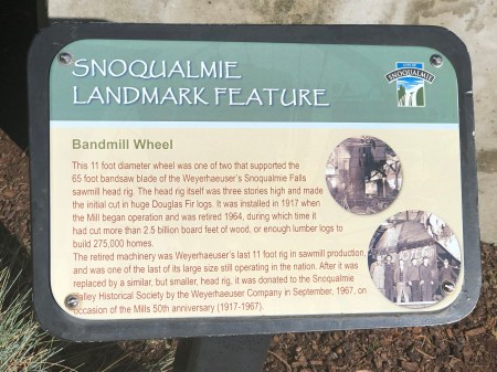 The Railroad was first constructed in 1889 and opened up the timber and lumber industry. Prior to the railroad, logs were floated down the river and over the falls. The Depot pictured above is now home to the Northwest Railway Museum. Engines, freight cars, passenger cars and locomotives are found on various tracks and sidings. The large metal wheel supported a 65 foot long bandsaw in an early mill.