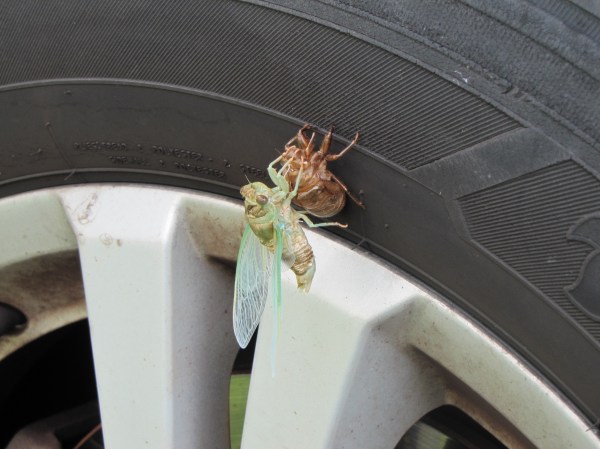 Last year was supposed to be the great 17 year mass cicada emergence across the Midwest and East coast. In our part of Indiana we only saw one cicada shell and heard none of the loud insects. Within the last two weeks we have heard a lot of cicadas at night. We have found four of them on the tires of our vehicle. One is in the photo, above. They missed the big show by a year…