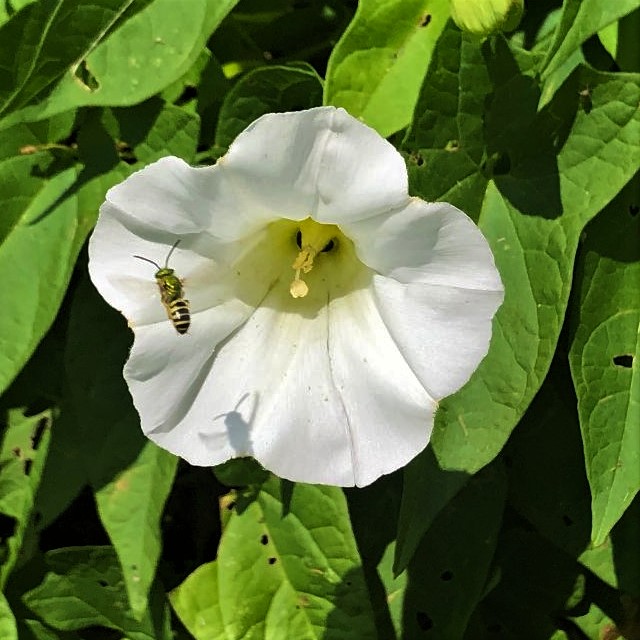 Noticed the morning glories in bloom. The result ended up with a bee photobombing the image. Even caught the shadow of the bee on the white flower petal.