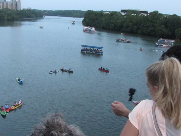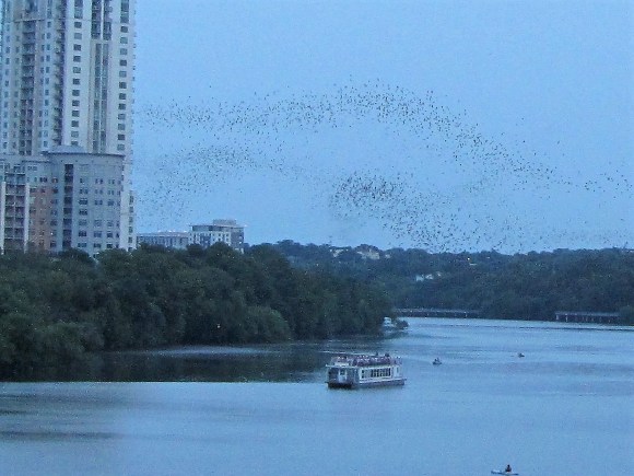 A viewing deck was on the river bank for a look up at the bridge. A wide variety of tour boats, canoes and kayaks were in place on the water of Lady Bird Lake waiting to see the show. And what a show it was! The first bats started to fly about 10 minutes before sunset. It didn’t take long for hundreds of thousands of bats to fly out from under the bridge. The sky was filled with masses of bats! It looked like they were flying along the river. Before the Congress Avenue Bridge was built where did the colony of bats spend daylight hours?