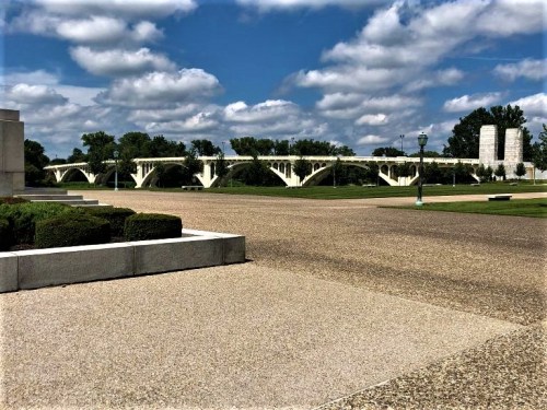 The bridge is what is called a deck arch design, and has two traffic lanes and wide pedestrian walks on each side of the roadway. It was opened to traffic in September, 1933, the same year that the George Rogers Clark Memorial was completed. President Franklin D. Roosevelt dedicated the monument in 1936.