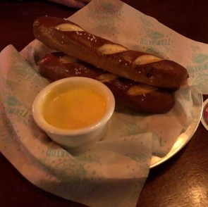 Two orders of the warm pretzels and hot cheese