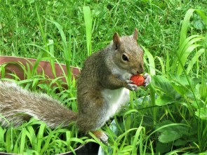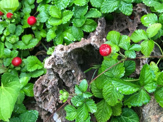 Wild strawberries on a decorative rock. Do the berries remind you of anything?