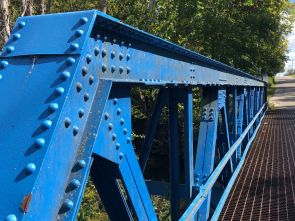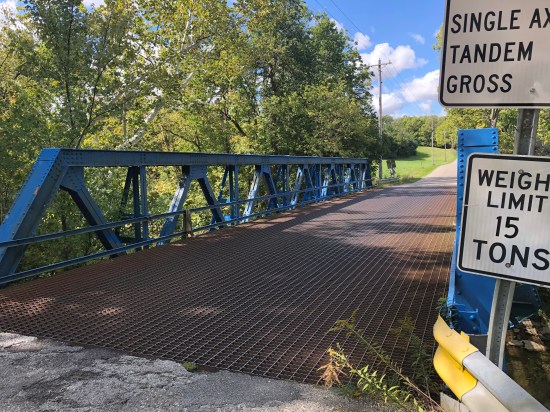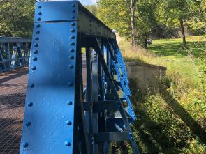 For those of you interested in truss design details, HistoricBridges.org describes the design and structure: Concrete abutments and wingwalls support the single-span Warren pony truss. The riveted structure extends 87’6″ in seven panels. Its all-interior verticals are manufactured from pairs of angles riveted together with stay plates and reinforced with external sway bracing. Its diagonals are made from a pair of angles (doubled in the outer panel) also riveted together with stay plates. The I floor-beams are riveted to gussets and the verticals above the lower chord and carry the concrete deck. The weight and varied size of the diagonals, the placement of the floor-beams, and the integration of knee or external sway braces into the verticals indicate a late stage in the design of all-riveted Warren pony trusses.