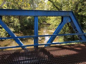 It is quite a visual as you approach this bright blue iron bridge. Like referenced above, you usually see green iron bridges, not blue. This is, however, a very nice bridge that spans a pretty little country creek.