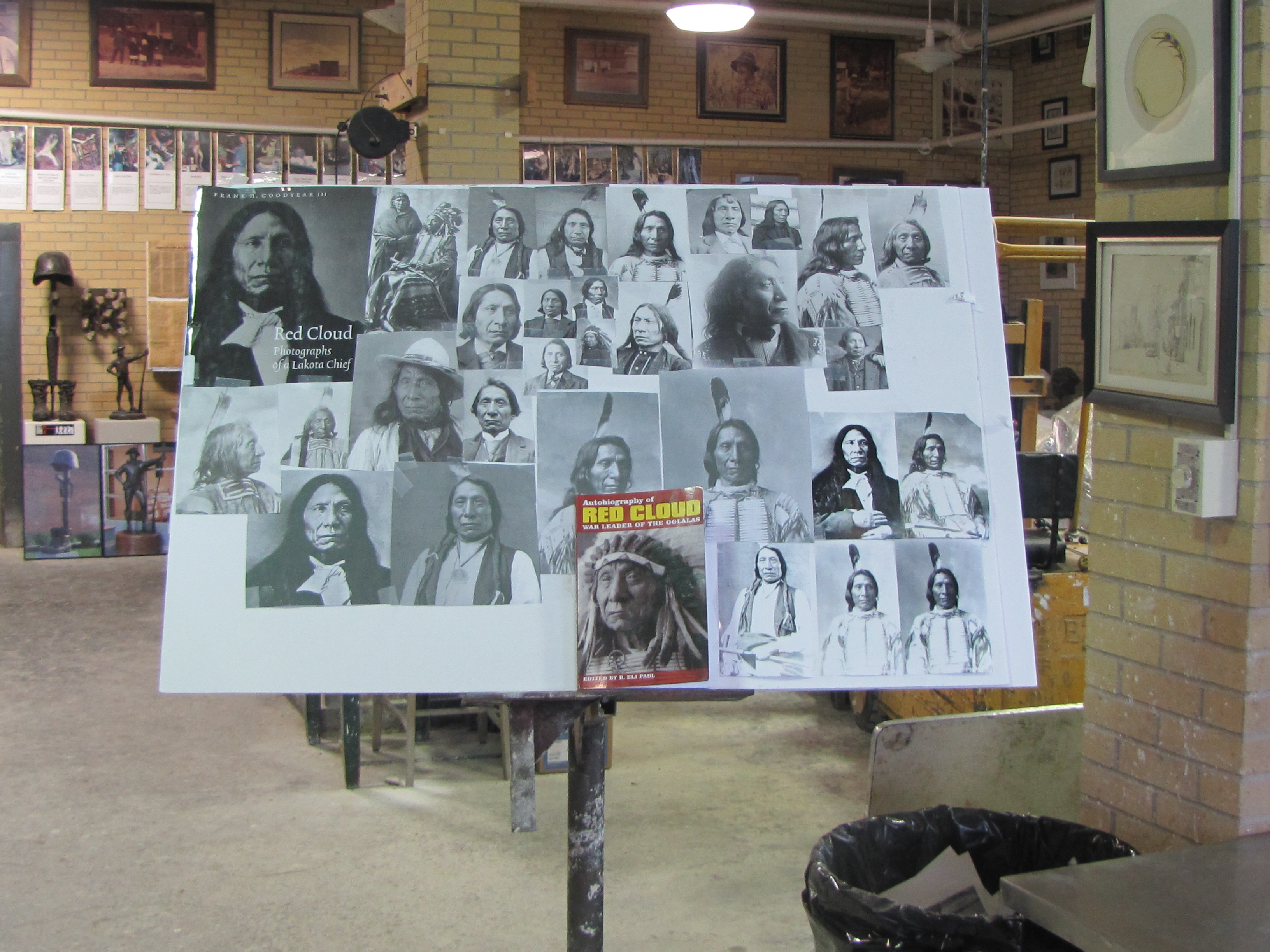 I was fascinated to learn that Alan spends so much time learning everything he can about the person who will be featured in his work. A bust of George Armstrong Custer is displayed on the first floor of the Gallery. A duplicate is now at West Point. Alan spent a lot of research time on the photos, life and times of Custer. Then I noticed a large board on an easel with mutiple photos and a book about Red Cloud, the famed Ogala Souix War leader. Thus I was able to see the beginings of what will in the future be another fine sculpture by Alan Cottrill.