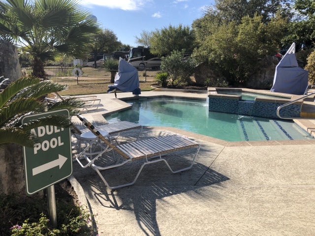 Our site is very level gravel with a nice concrete patio including a picnic table. We are very close to the swimming pool laundry and all of the facilities.