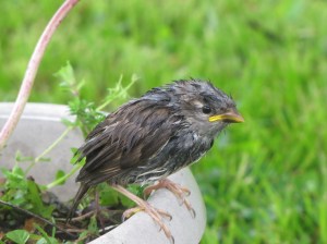 After a pretty good rain storm a while back we noticed that a hatchling had fallen out of a nest in a tree limb in our backyard. This little fella looks quite wet and disheveled. One of the parents did come down to the ground in front of the hatchling, and the last we saw of the two (adult and youngster) they were still together across the yard. We can only hope that this story had a good ending.