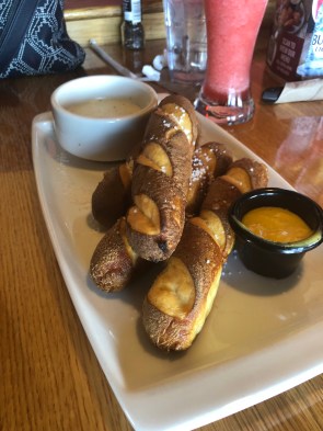 Maj loved the Philly Cheesesteak with Shaved Ribeye, Sautéed Peppers and Onions, Provolone, Horsey Sauce and a Hoagie Bun. We also ordered Soft Pretzels with House Beer Cheese and Sweet and Spicy Mustard. Both sandwiches came with fresh made potato chips.