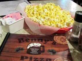 You start you culinary adventure at Benny’s with a large basket of freshly popped popcorn to munch while you read the menu. Three of us were dining and it took us a while to decide on our ordering strategy. Pizzas? What toppings? Half and Half’s? Dinners? Subs? Whew! Everything looked so inviting!