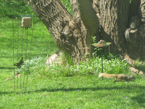 Today we sat out back on our swing and did some wildlife watching. We filled both bird feeders, mounted a suet cage, and even put a couple of ears of field corn on trees. All the critters should be happy. Our son also filled one of the bird baths and put a couple of rocks in it for some for the birds to stand on while drinking. See photos above when a squirrel was surprised.