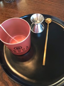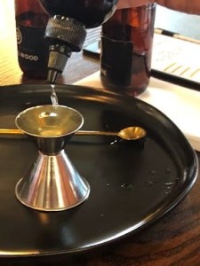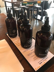 The staff recommends that you pick four scents that you want to start experimenting with. Once you have that, four squeeze bottles are brought to your workspace. Holding the bottles under your chin, squeeeeeze and smell. Two at a time will give you the future candle fragrance. Mix and match, determine of the scents which may require more than another. You are guided through the process.