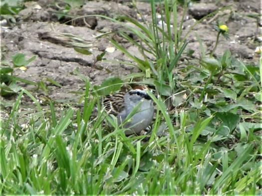 This is a Chipping Sparrow peeking through the grass. Notice the cute little red cap on its head. We see this sparrow quite often in our yard, and this guy likes to feed on the ground instead of the feeders.