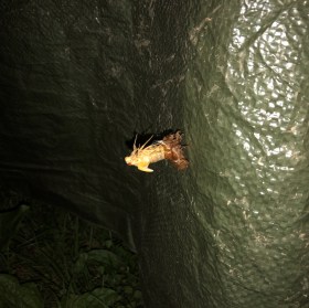 It was long after dark when we spotted one hanging on a tarp that we had over some stuff on a couple of card tables. The cicada is crawling out of its now hard shell.