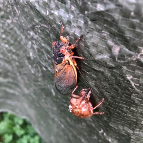 This morning the cicada was beside its now abandoned shell. Usually they are on tree trunks at this point, but this guy ended up on a green tarp.