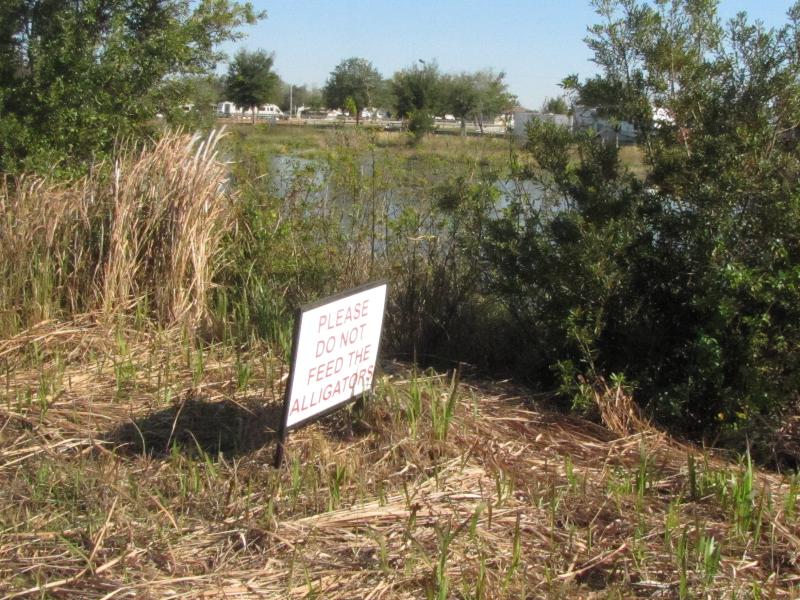 The sign next to a nearby pond is rather ominous. The pond is about 20 yards from our spot. One of the vendors here told me that if there are no birds on a pond it is a good sign there will be ‘gators in the pond. I guess ‘gators like to eat birds that land on the surface. Hmmmm. We have seen no birds land on the pond or the banks of the pond…