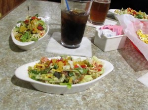 I finally decided to order the smoked brisket with the house BBQ sauce and beer battered fries for my side. Sher and our son went with the family sized pizza, half veggie and half “All the way”,  a cute name for lots of variety of toppings. We all ordered a Southwest 7 layer salad as well.
