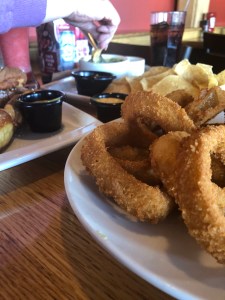 Applebee’s sounded like a reasonable choice. The place was not busy and we were seated immediately. The placard on the table proudly announced half price appetizers. Those sounded good!