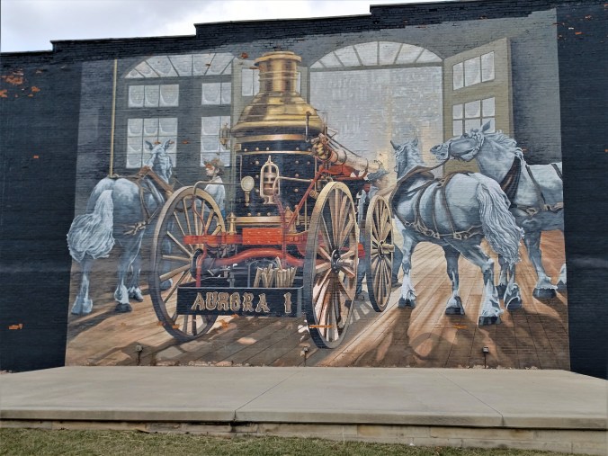 In 2017 Mr. Don Andrew, a local resident and businessman, commissioned the Christian Dallas Art company to paint a mural on the side of his building depicting the Aurora in her stable with the team of horses being hitched up. Andrew paid $11,000 towards the total cost of $16,000. The rest was paid from the City of Aurora’s 2017 Facade Improvement Grant funded through riverboat gaming. This mural will really catch your attention when you first come into town on the Ohio River Scenic Highway.