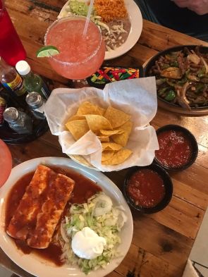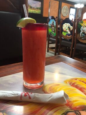 The lunch crowd had pretty well finished when we got there, so immediate seating was no problem. Like most all restaurants of this genre a bowl of fresh chips and a couple of bowls of salsa were soon on our table. We then ordered margaritas.