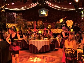 The lobby offers coat check, a full bar, and even a “Boutique” for purchasing boas, masks, hats and other trimmings for your outfit. We were seated at our table big enough for 8, but private for the four of us. It was an amazing sight to see how ornate and big the tent was!