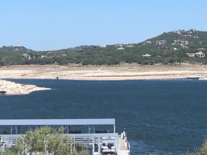 This photo was taken today from a road to a Hudson Bend marina. the water level is very low…