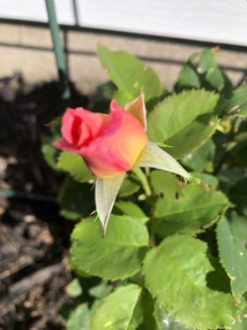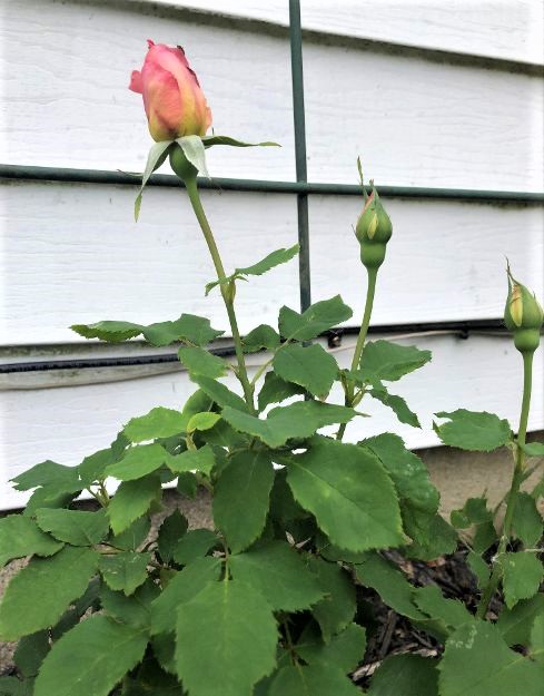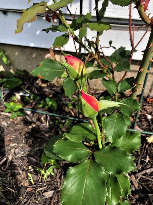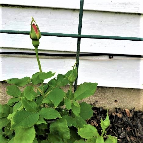 This is a new rose bush that we planted about a week ago. The first rose bud is showing some color. There are two more buds developing to the right of the big one.