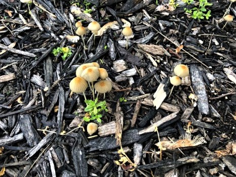 There are lots of little mushrooms showing up in the mulch beds. The remnants of maple tree whirligig flying seeds are also in view, along with some unidentified green sprouts of some kind.