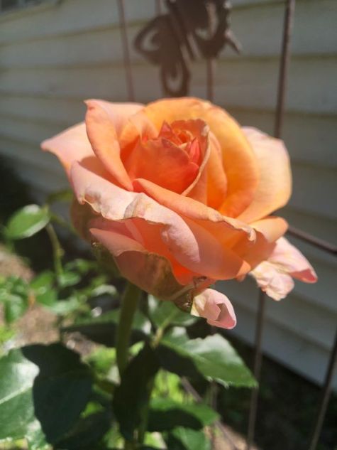 A persistent morning glory vine slowly encircles the rose. Our vine blooms are all white.
