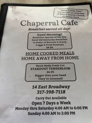 You always hear that the local, non-chain eateries are the best. The Chaperral Cafe in Shelbyville, Indiana proves that theory is correct! Located a couple of blocks from the downtown square, this landmark is known for its all day breakfast and “the best breaded tenderloin” around.