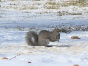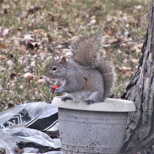 Today we sat out back on our swing and did some wildlife watching. We filled both bird feeders, mounted a suet cage, and even put a couple of ears of field corn on trees. All the critters should be happy. Our son also filled one of the bird baths and put a couple of rocks in it for some for the birds to stand on while drinking. See photos above when a squirrel was surprised.