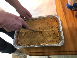The simple ingredients were fairly easy to mix in the pan over medium heat. Once everything was mixed we pressed it into the aluminum pan, roughly an inch thick. After setting in the freezer for about we cut the the appropriate size cakes for the cages.