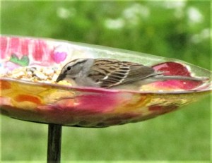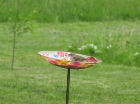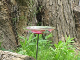 Sher spotted some small but pretty bird baths in a local store’s ad flyer. We decided that they would be a nice addition to our backyard. We thought that we’d use one of the glass receptacles as a true water filled bird bath. The second, however, for now we put bird feed in the second one as a shelf feeder.