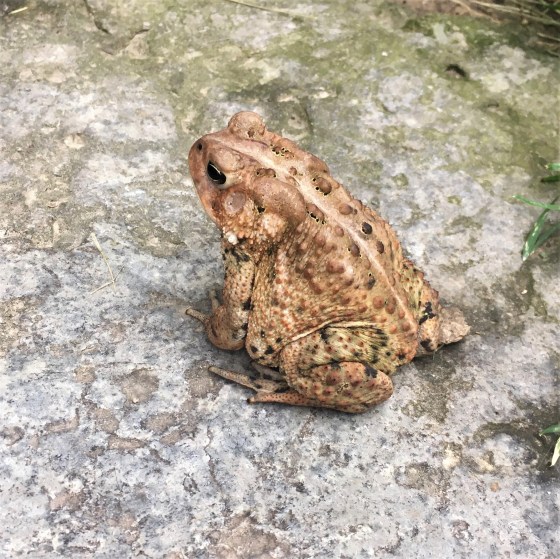 We got this picture of a big toad outside our son’s house recently. Our grandson (Kindergarten age) immediately proclaimed that he had already seen this toad. Not just any toad, but this one. Kids know critters, so who are we to doubt him?