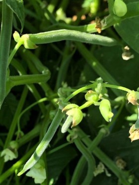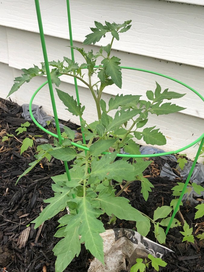 This year we bought two plants instead of growing from seeds. The last photo is from a different plant from the other images. The header at the top of the page is actually of a “volunteer” plant that just showed up in the backyard. It seems to be doing well and will soon earn the right to have its own tomato cage.