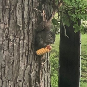 We put one ear of corn each on two different trees in our backyard. When I first got up this morning neither ear had been touched. Then a second check a little later revealed that one of the ears was now completely devoid of kernels. The squirrel had moved to the second ear, which was on the tree closer to the house. It was grabbing a kernel and then burying it close to the tree. About every fourth kernel buried he would stop and eat one! The squirrel is, as I write this, continuing to take the kernels off this second corn cob. Fun to watch, but now I have to decide how much corn to put out.