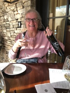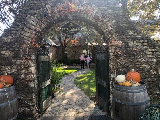 Anyway, it was most enjoyable trying the five different wines. In addition to those five, we asked about any sweet wines. Fall Creek Winery has one, Gotas de Oro, a mix of 49% Muscat Canelli and 51% Chardonnay. Sher is holding that bottle in her picture. We liked the wines. We bought the bottle Sher is holding, and we also bought a bottle of the Chardonnay and one of the GSM, a mixture of Greenache, Syrah, and Mourvèdre. This is yet another fun and relaxing winery that we have enjoyed. Plus we had the carry-outs again. Good times with each other and our dear family.
